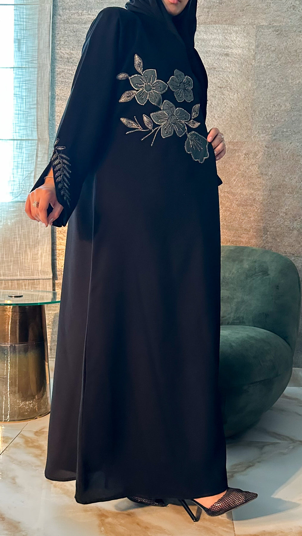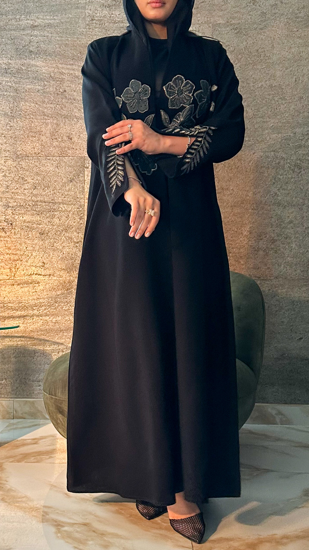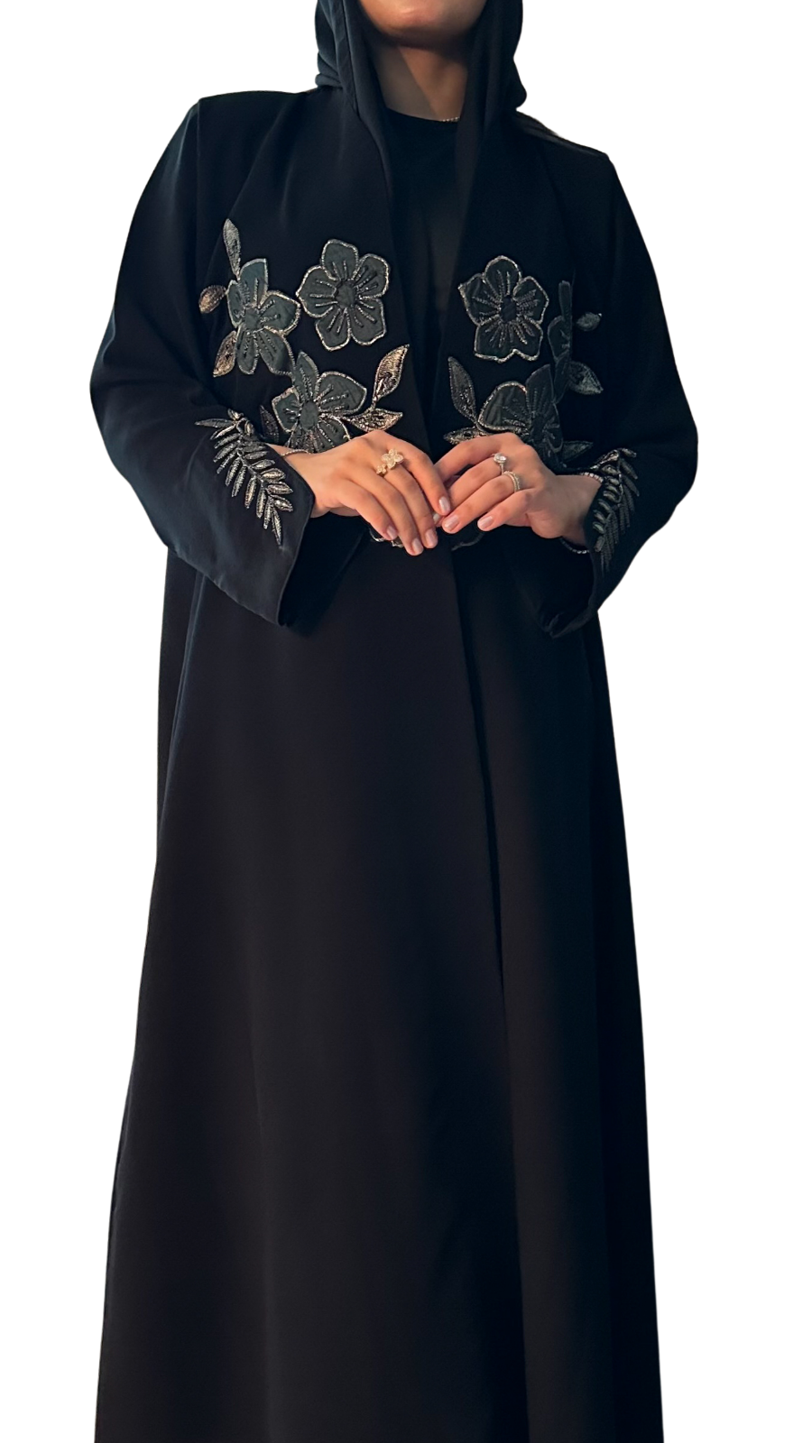 عباية نص كلوش صيفية من سيراميك خفيف غير شفاف بتطريز وردي أنيق وطرحة سادة مرافقة.