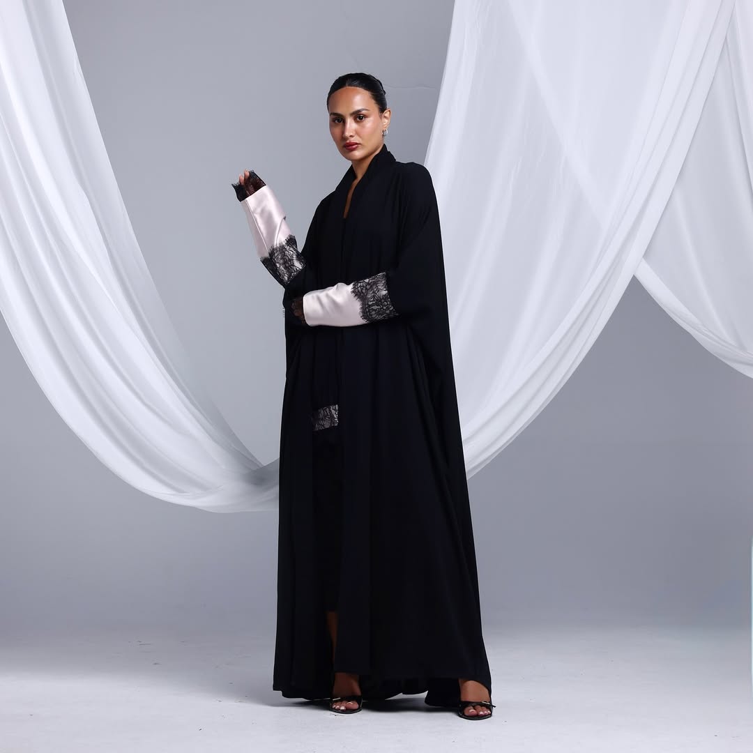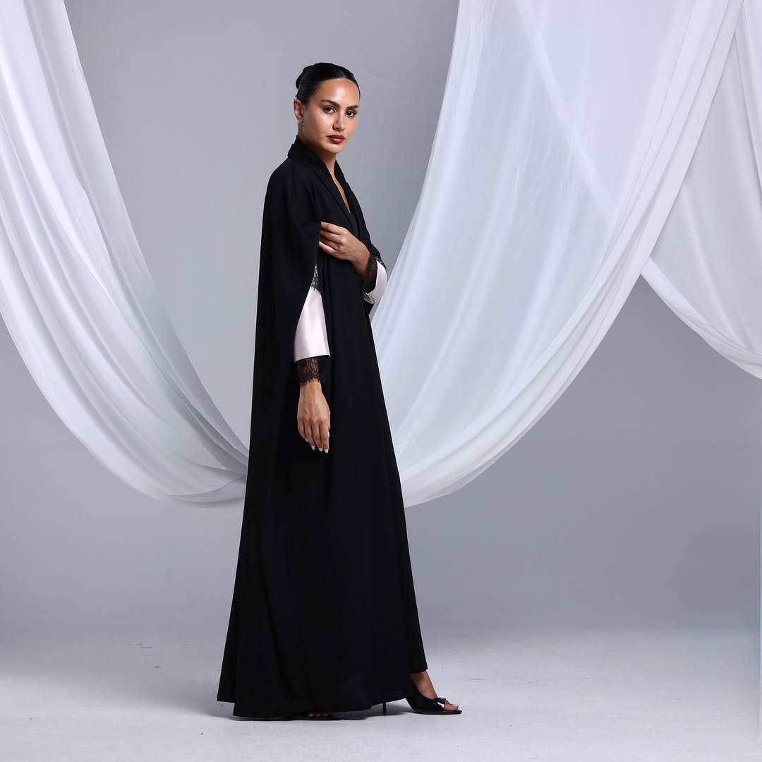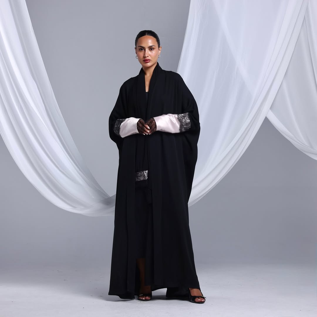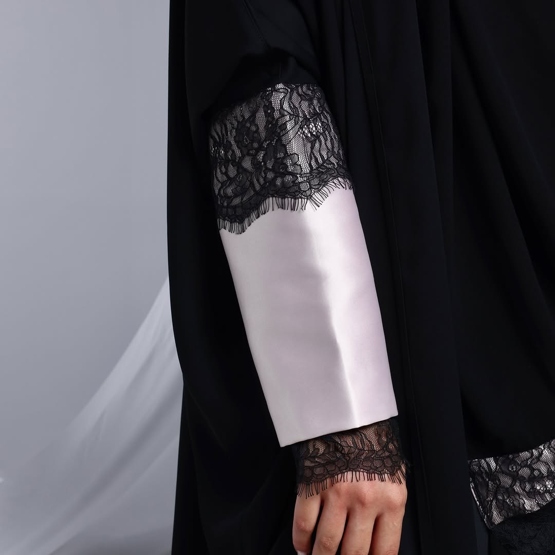 Blush Lace Cuffs On Crepe — عباية كريب سوداء بأكمام بلَش ودانتيل