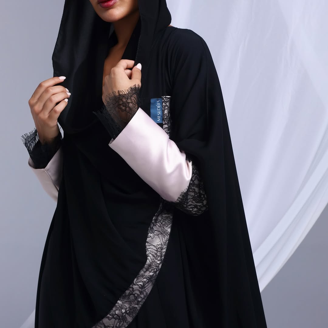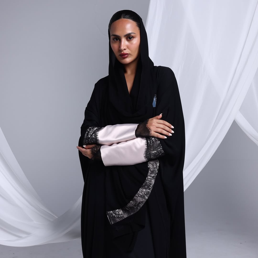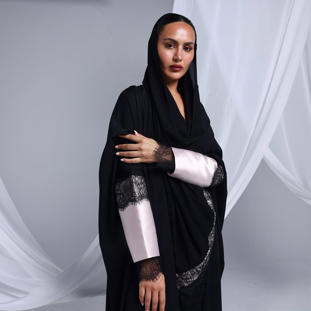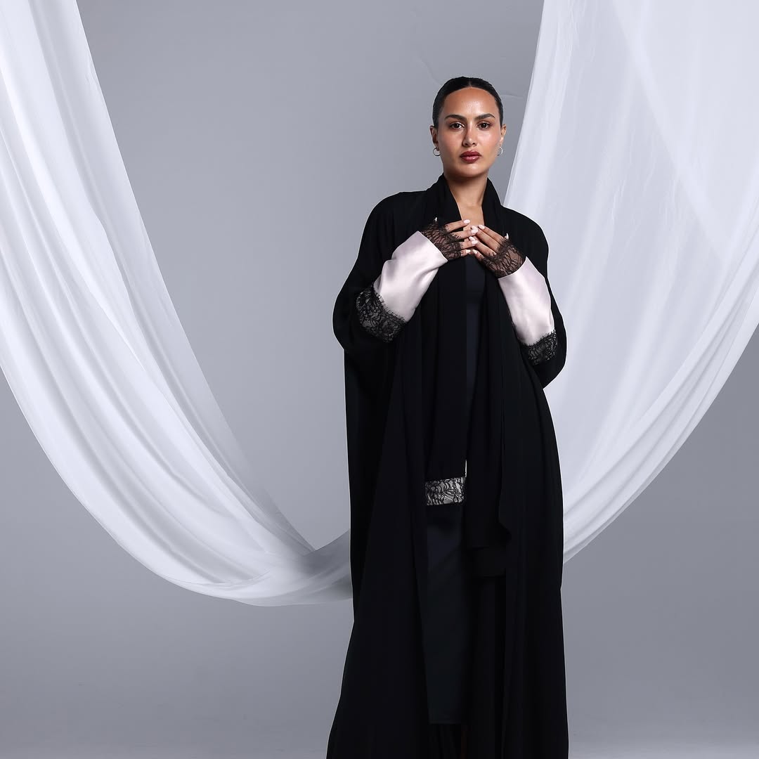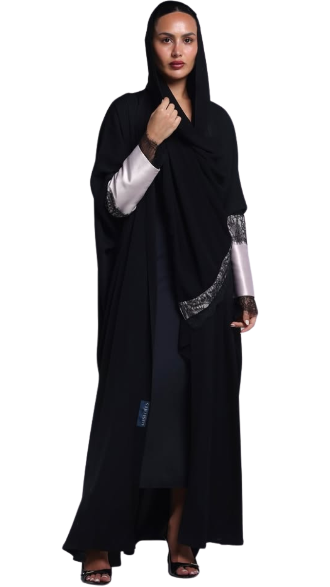 Blush Lace Cuffs On Crepe — عباية كريب سوداء بأكمام بلَش ودانتيل