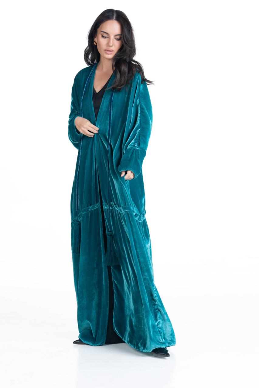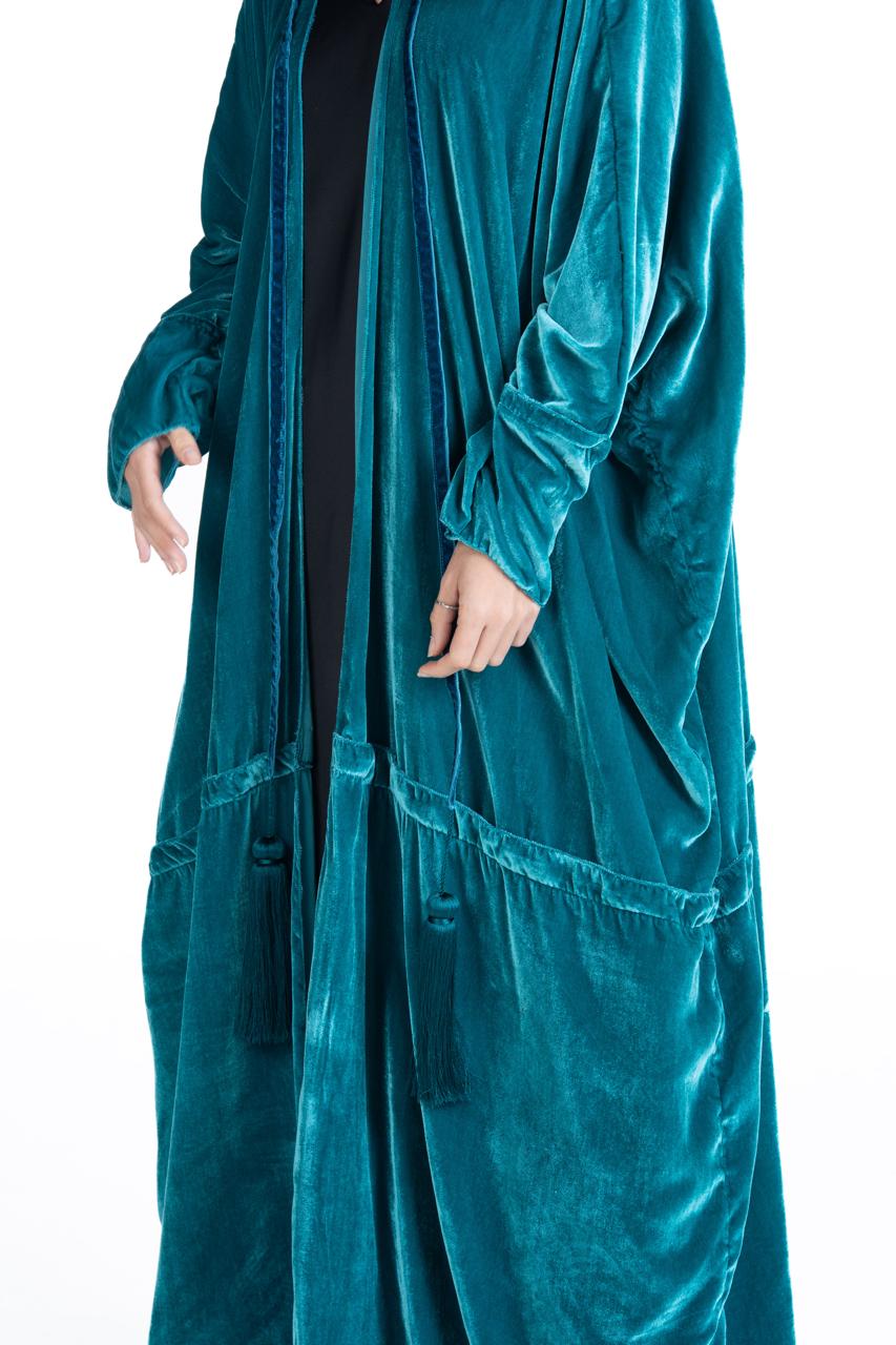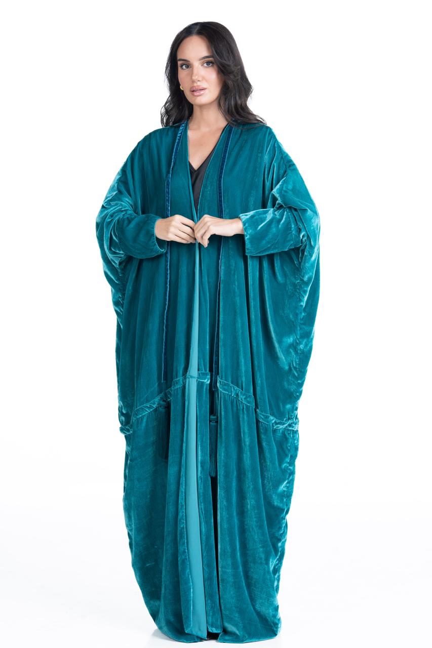 عباية مخمل بتصميم نص بشت أنيق بلون أخضر مائل للأزرق (تركوازي غامق)، تتميّز بقصّة فاخرة ولمسة راقية تعكس الأناقة والتميّز