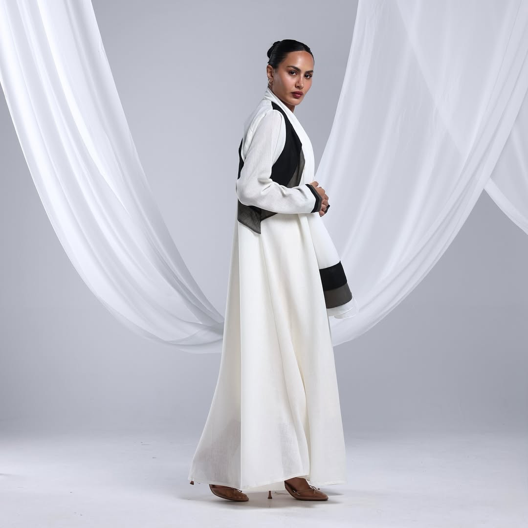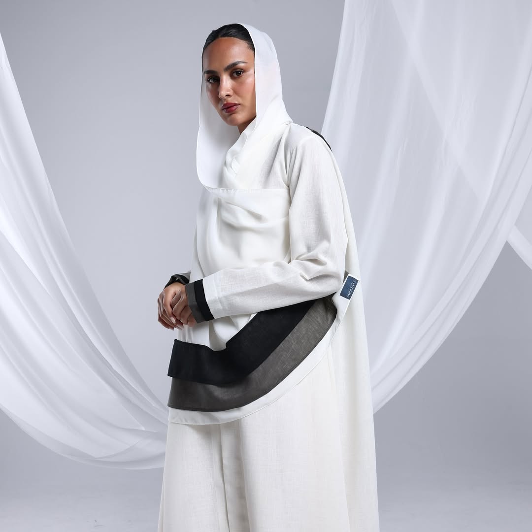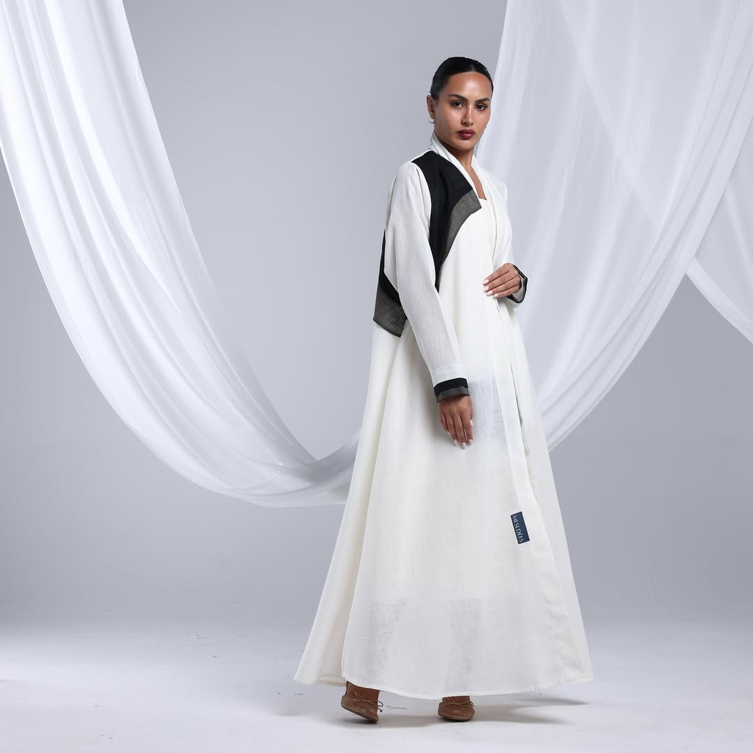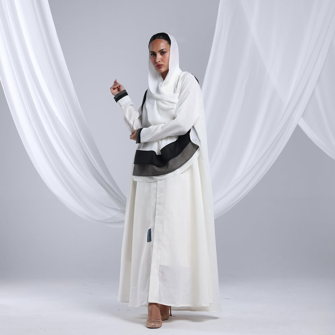 Linen Diagonal Overlay — عباية لينن أوف وايت بطبقة مائلة