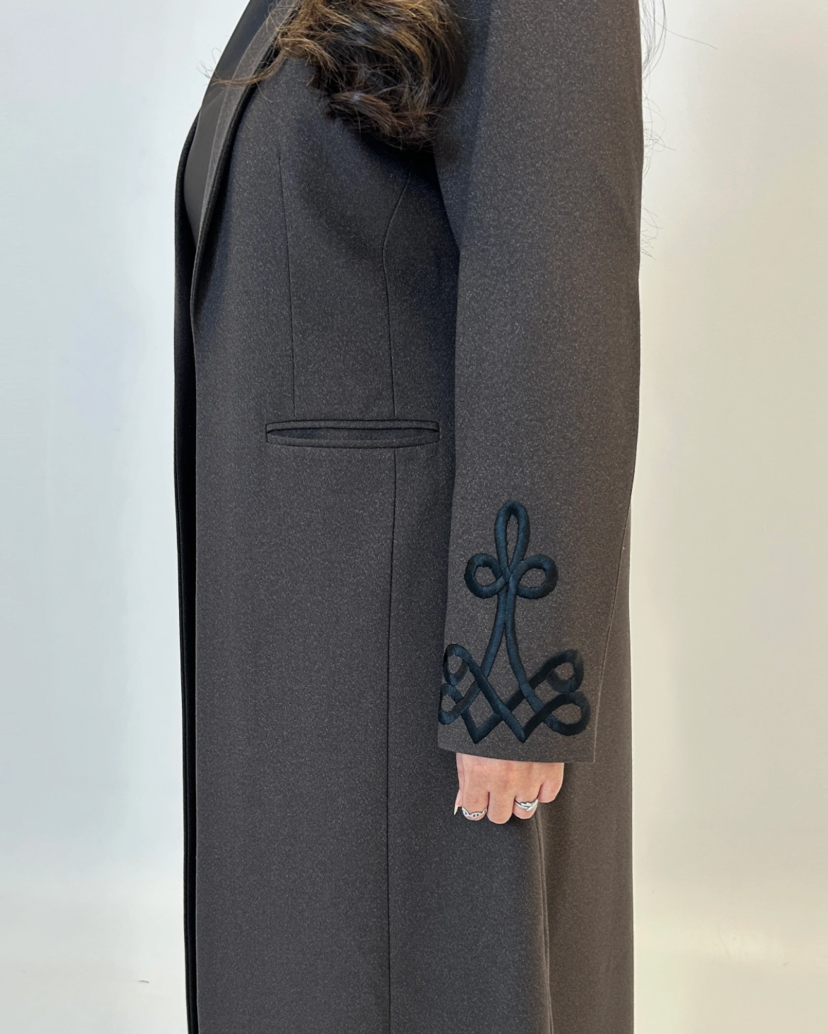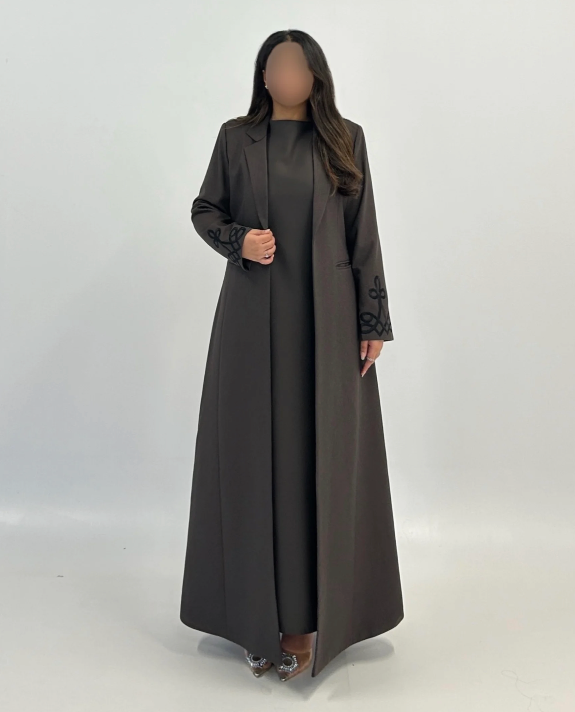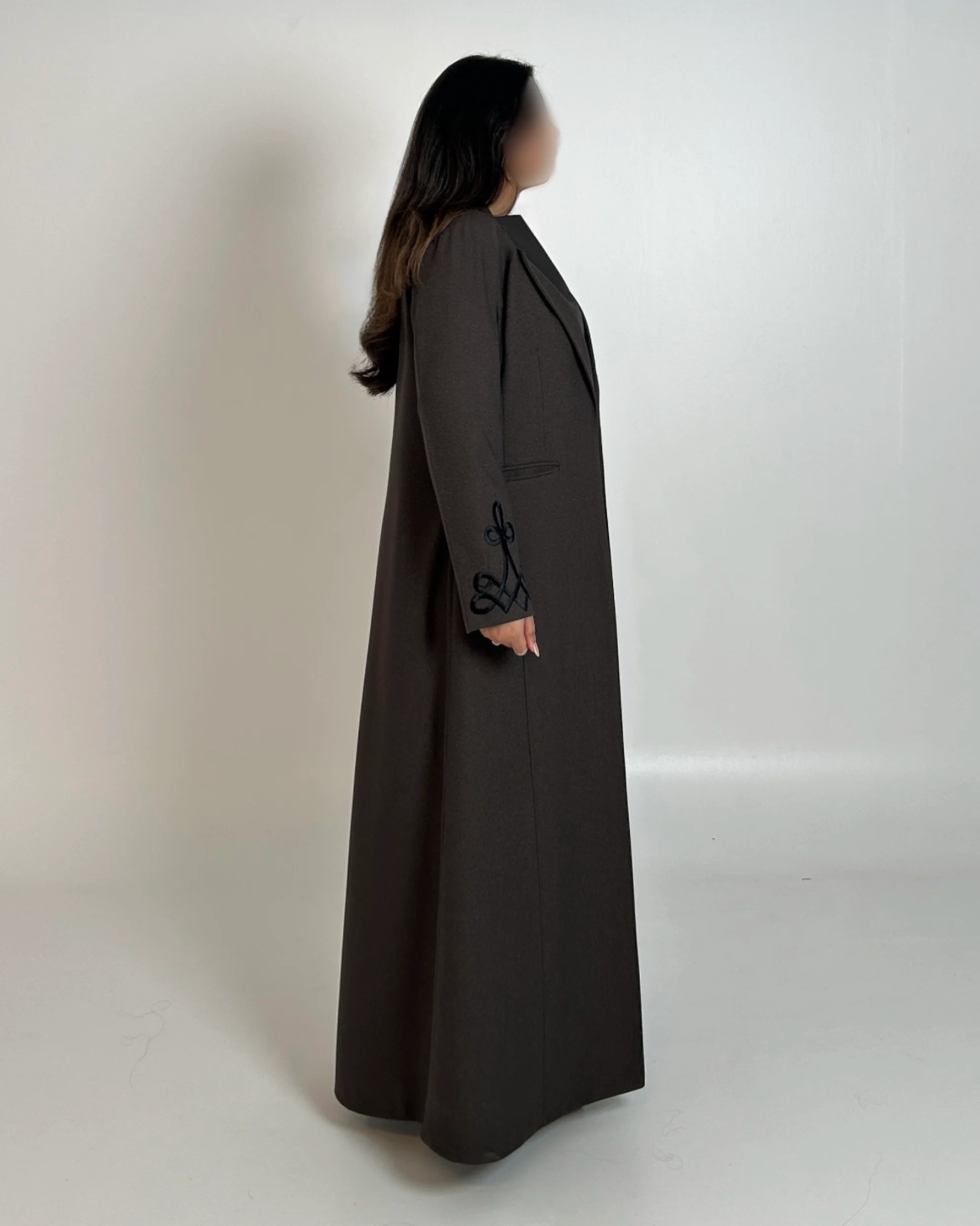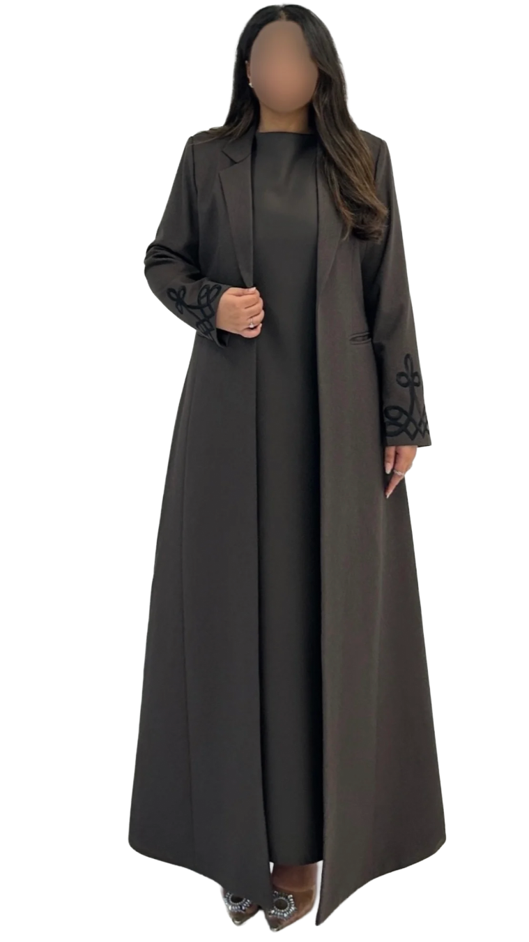 عباية جوخ بقصة بليزر أنيقة، تتميّز بتطريز يدوي ناعم على الأكمام يضفي لمسة فاخرة.